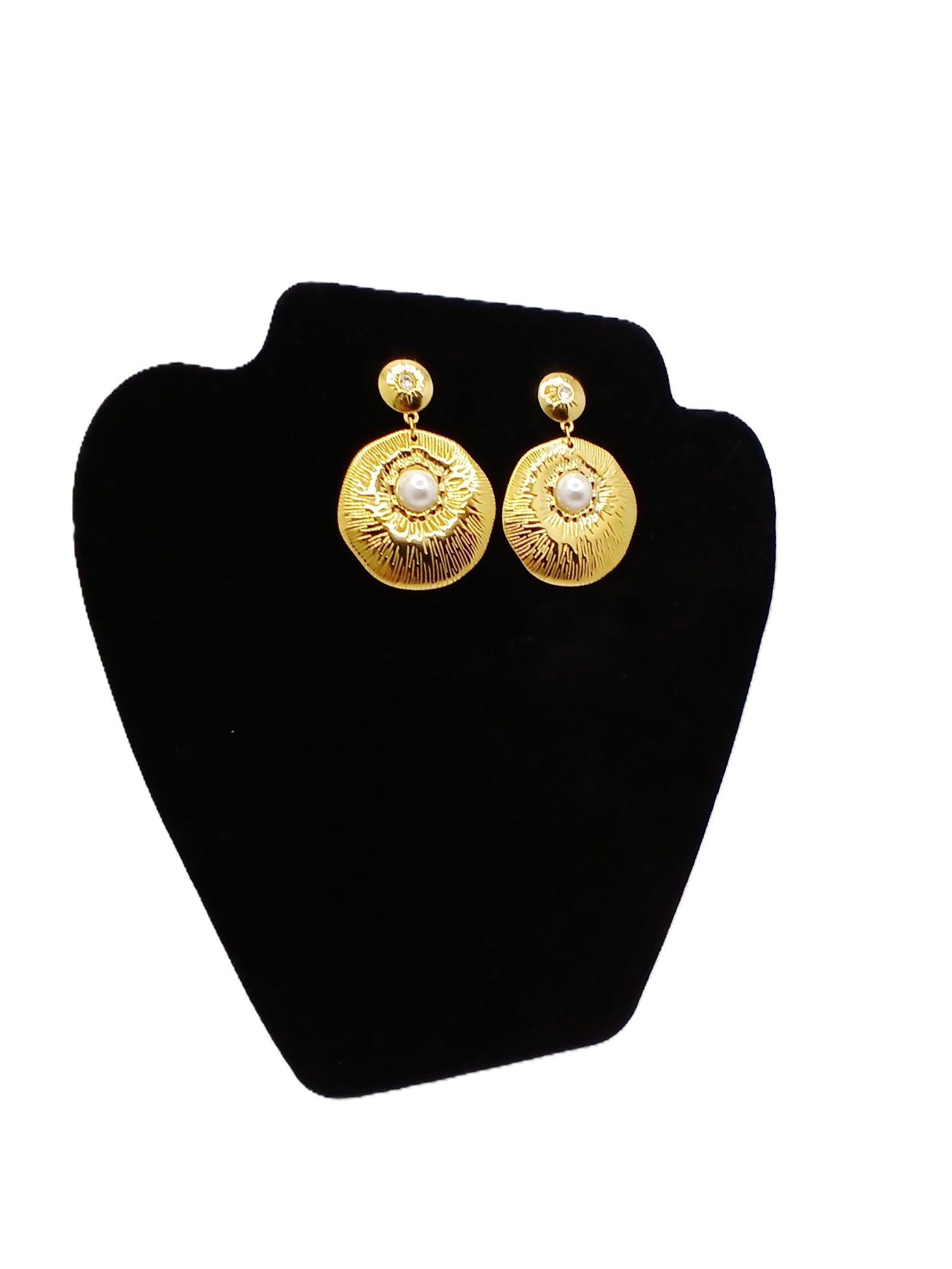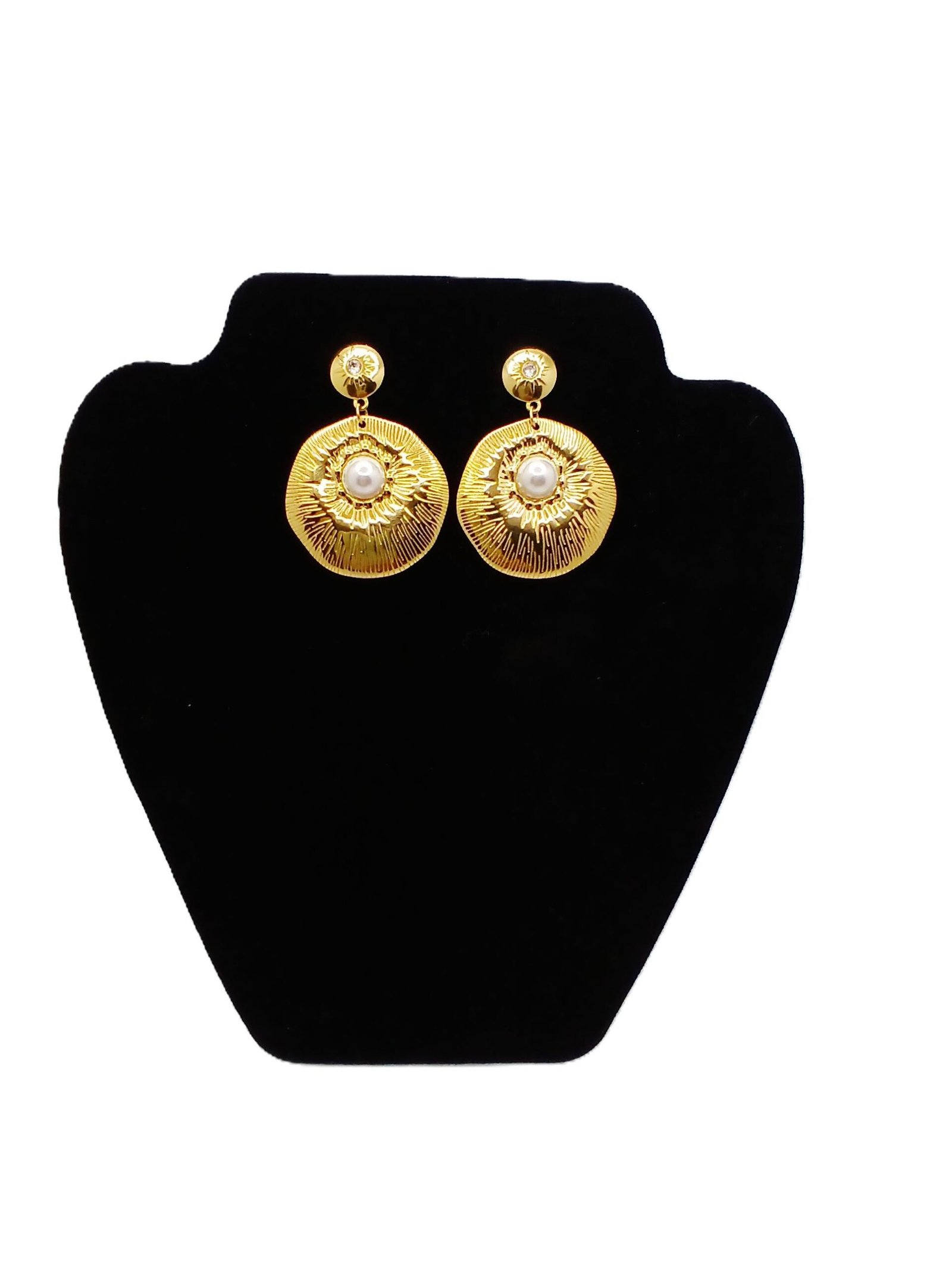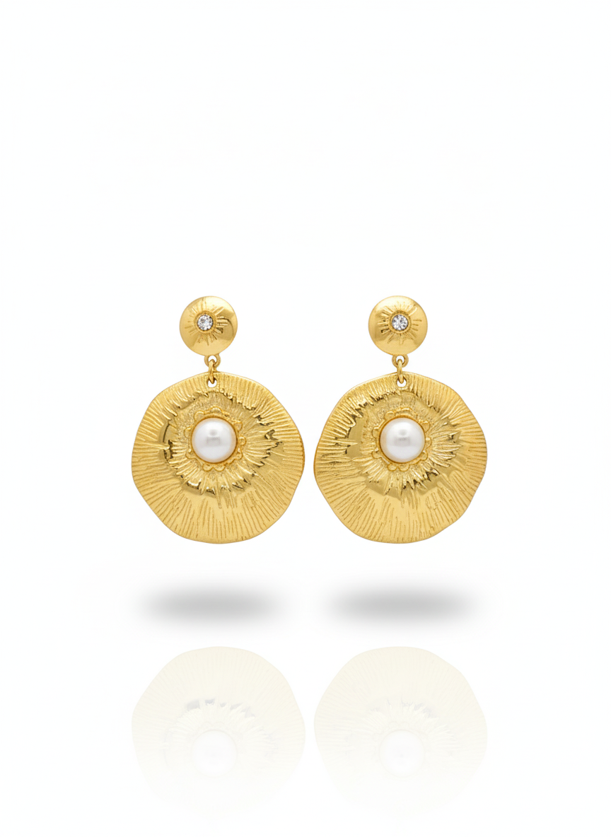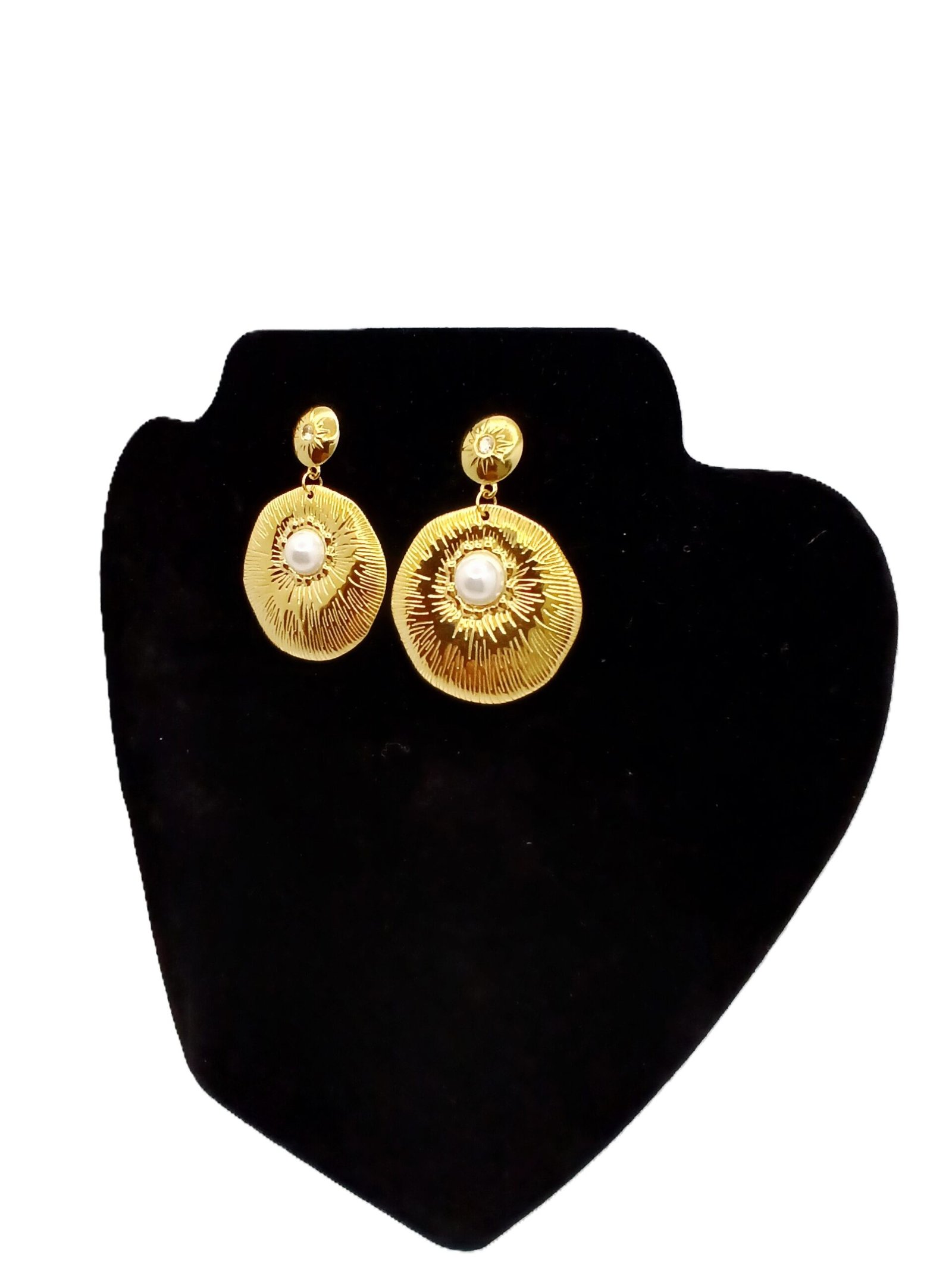 Ces boucles rondes, mettent en valeur une perle nacrée en leur centre. Leur design texturé et leur éclat doré apportent une touche de sophistication intemporelle à toute tenue.