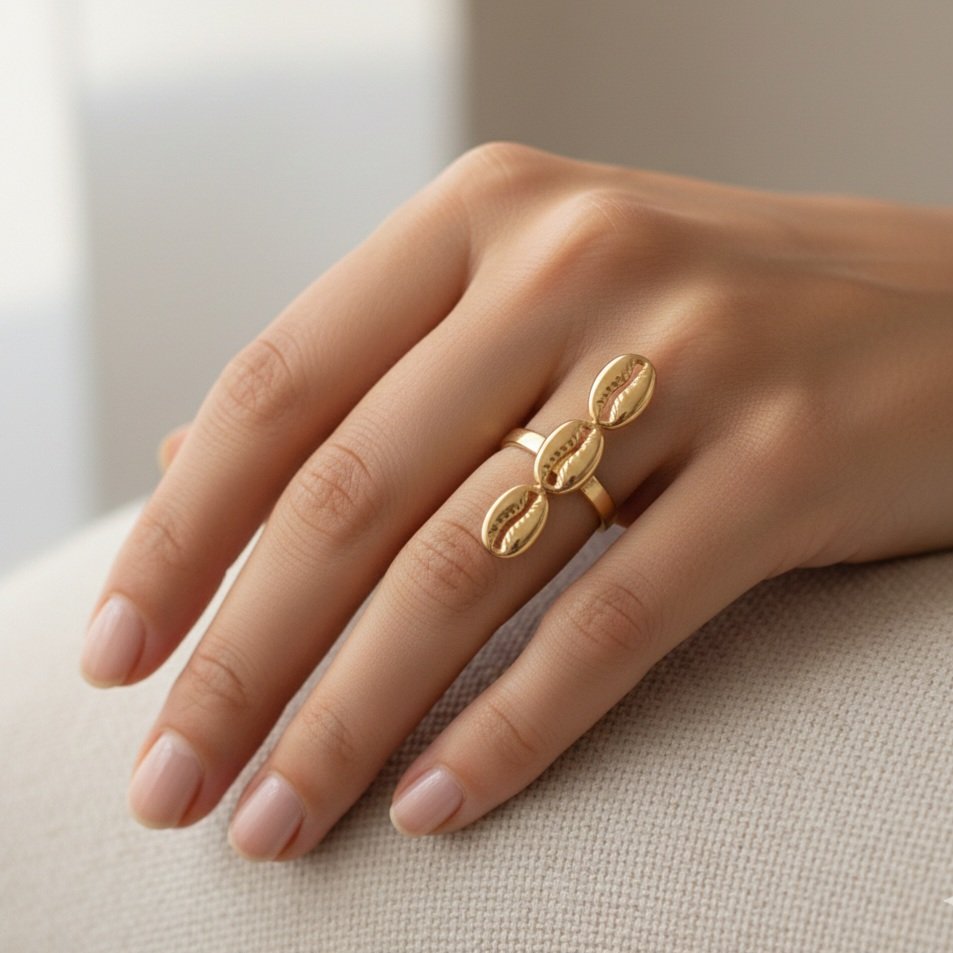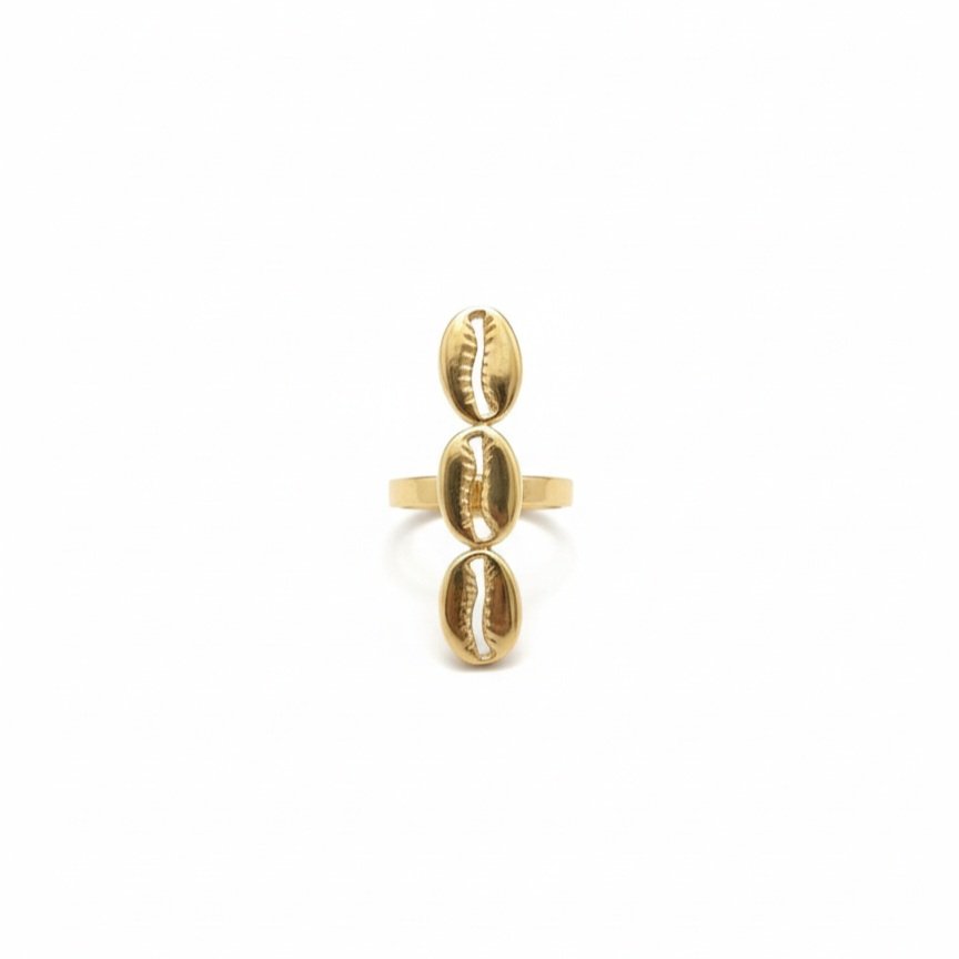 La bague : Une pièce ajustable au design vertical, alignant trois cauris dorés pour un effet allongé et moderne sur la main.