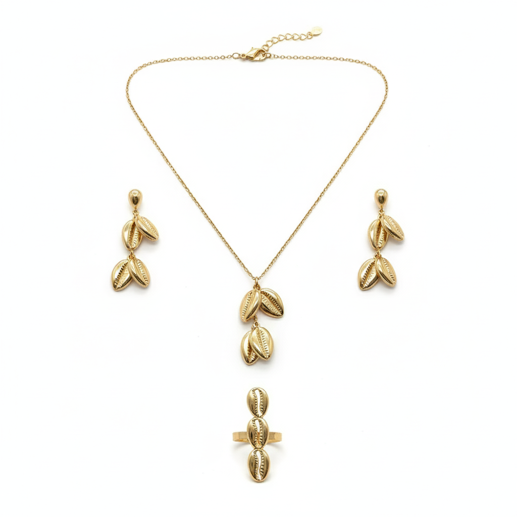 Inspiré par la forme emblématique du coquillage cauris, cette parure complète en finition doré apporte une touche de lumière et d’exotisme chic à votre style.